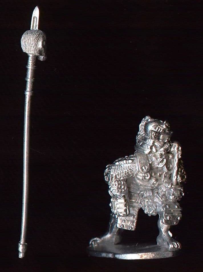 BG9 Fully armoured Dai-Bakemono goblin. This figure wears full Samurai armour and is supplied with a separately cast spear on which is impaled a human head. The right hand is cast open ready to receive this weapon. The left hand holds a short staff apparently topped with a skull like object. He stands 30mm tall. Engraved on the underside of the base is DM (Dixon Miniatures) BG9 ©