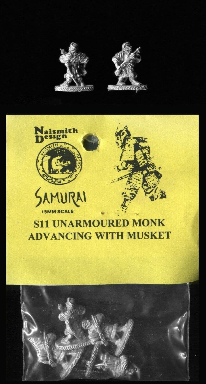 S11 Unarmoured monk advancing with musket. Six identical models. The figure is bareheaded with a sweatband tied round his head. He holds a musket in both hands and has a sword on his left hip. He stands approximately 15mm tall.